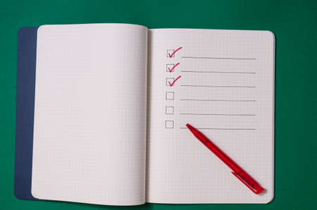 To-do list with several points. Open notebook on green background. . Large text field