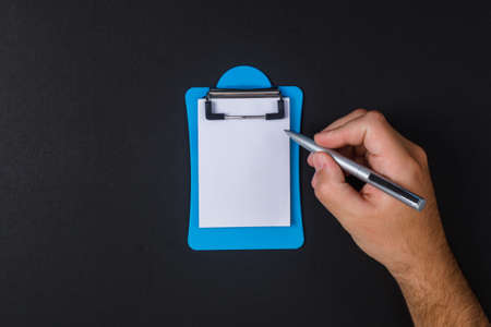 Taking note concept with mini note papers on black desk backgroud flat lay. man taking note. free space for your text horizontal image