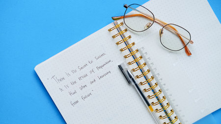 Flat lay style set. Office stationery. Business concept. Top view of modern office supplies on table. Business mock up with handmade motivational quotes over blue background