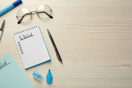 Flat lay composition with to do list on wooden table