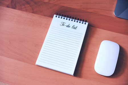 A spiral-bound notepad with a to-do list sits on a light brown wooden desk next to a white wireless computer mouse. The list is blank, ready for tasks.