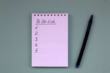 High angle view of a notepad with the to do list and a pen on grey desk
