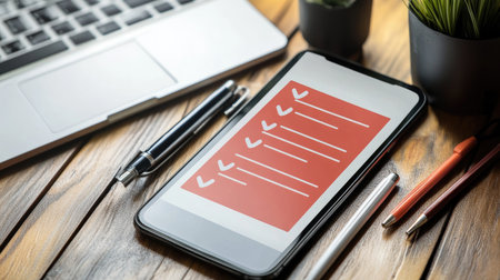A mobile phone displaying a task list on a stylish wooden desk, accompanied by a laptop, pens, and a small plant, illustrating organization and productivity in a workspace.