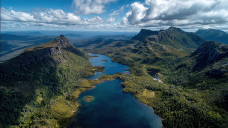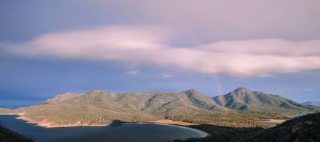 Picturesque mountain landscape with mountain range and lake. Cradle mountain, St Claire National park, Tasmania, Australia