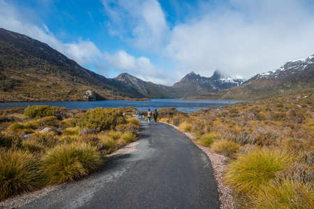 Couple looking at Dove Lake Cradle Mountain-Lake St Clair National Park Tasmania, Australia.