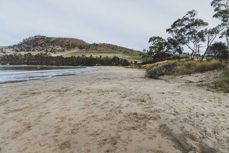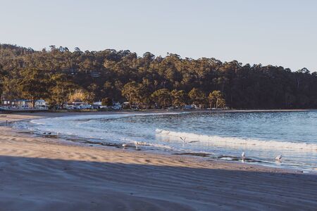 sunny Australian beach in Cremorne, Tasmania looking beautiful and deserted in winter