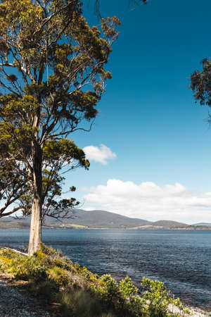 wild Tasmanian landscape and pristine turquoise water of the Derwent River as seen from Legacy Beach near Coningham beach south of Hobart