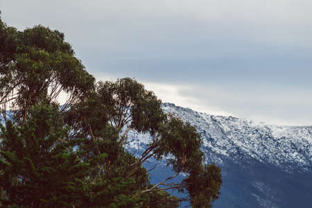 snow-covered mountain tops surrounded by thick vegetation in Tasmania, Australia in winter