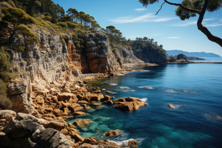 the towering cliffs, surrounded by the azure sea, with waves crashing against the rocks, created with generative ai