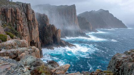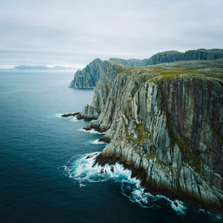 A stunning view of rugged cliffs meeting the turbulent ocean, highlighted by stormy weather and mist. Ideal for nature lovers and adventure seekers, this scene captivates with its raw beauty.