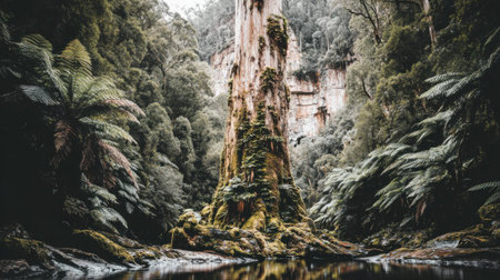 Towering ancient tree with mossy trunk stands in dense fern filled forest surrounded by misty greenery and reflective water pools