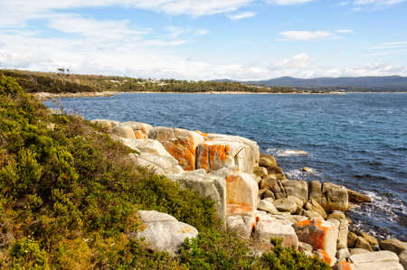 Granite boulders draped in orange lichen - Binalong Bay, Tasmania, Australia