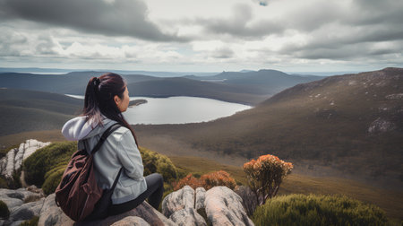 Woman hiker sitting on the top of a mountain and looking at the lake