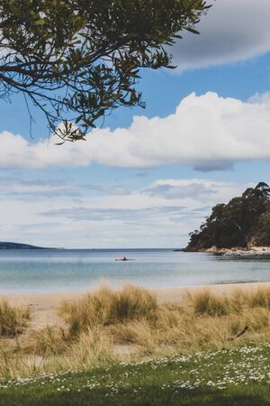HOBART, AUSTRALIA - August 31st, 2019: beach landscape in Blackmans Bay in Hobart, Tasmania in Australia