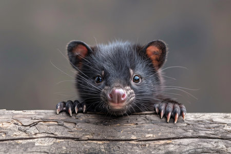 Close-up of a young black Tasmanian devil peeking over a log, showcasing its cute features.