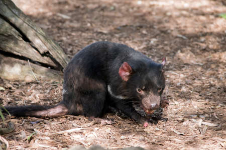 closeup of a tasmanian devil eating meat, Endangered animal specie from Tasmania in Australia