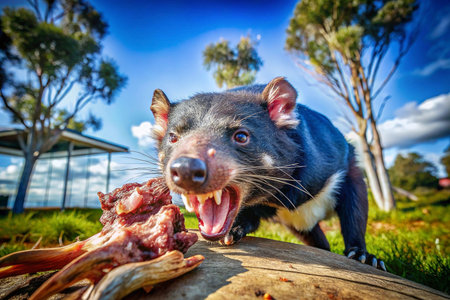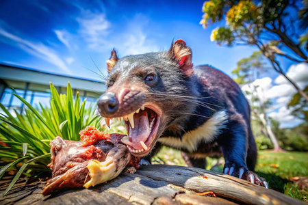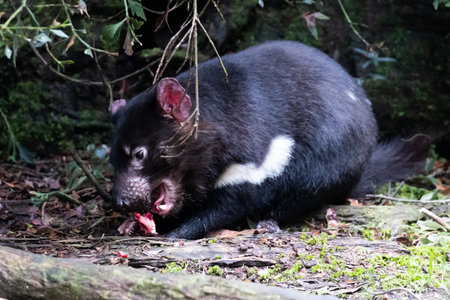 A Tasmanian Devil is captured in the midst of scavenging for food, its mouth agape in a wide-open position, showing its sharp teeth and fierce expression.