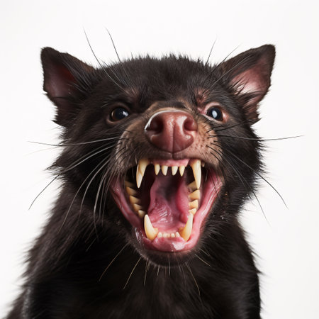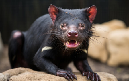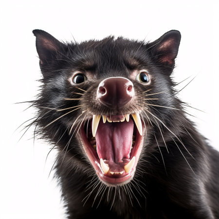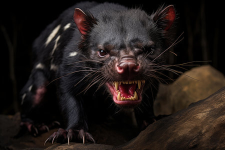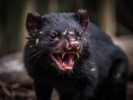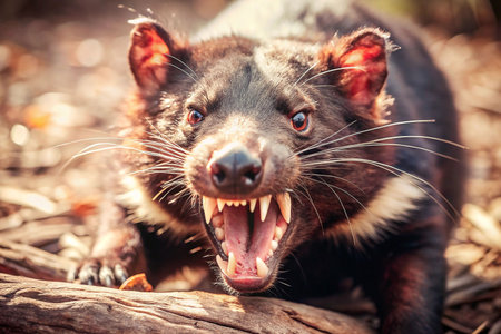 A Tasmanian Devil, its strong jaws open in a fierce snarl, reveals the raw intensity of life in the wild. This marsupial's nocturnal habits and ferocious nature contribute to its reputation as a formidable predator.