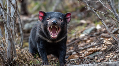 A Tasmanian devil (Sarcophilus harrisii) yawning in the forests of Tasmania, its powerful jaws and sharp teeth a fearsome sight in the underbrush.
