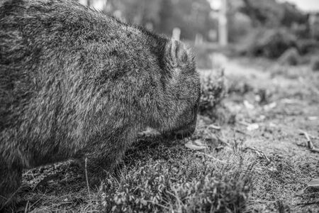 MARIA ISLAND, TASMANIA, AUSTRALIA- MARCH 2019: Wombat (Vombatus ursinus) grazing in the Australian bush.