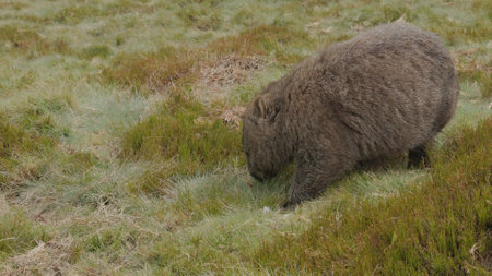 Large adorable wombat during the day looking for grass to eat in Cradle Mountain, Tasmania