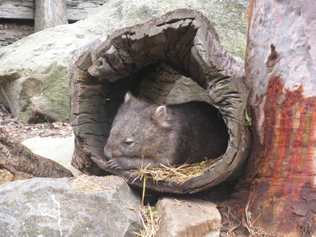 MARIA ISLAND, TASMANIA, AUSTRALIA- MARCH 2019: Wombat (Vombatus ursinus) sleeping in the Australian bush.