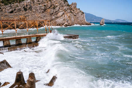 Rough sea with waves crashing against cliffs in Crimea, black sea, view from Yalta, swallow's nest