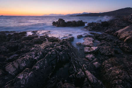 Rocky seashore seascape with wavy ocean and dramatic and beautiful sunset at sea caves coastal area in Paphos, Cyprus