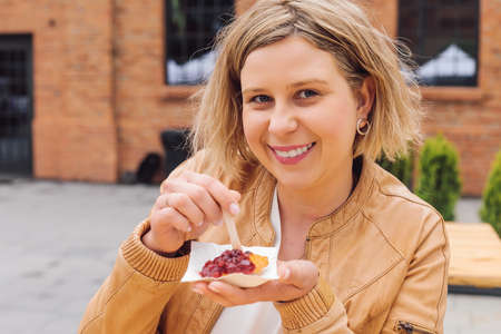 Smiling young woman looks at camera and holdsplate of fried cheese with berry jam in her hand. Taste and pleasure. Travel and tourism. Lifestyle. It's a great time.Traditional national cuisine.