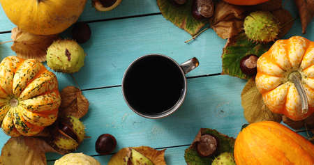 A cup of coffee with autumn leaves and chestnuts. On a blue wooden background