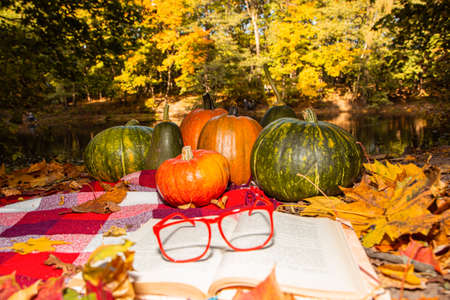 Sweater, book, pumpkins and fallen leaves in autumn park