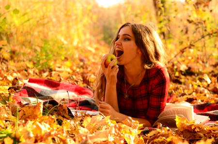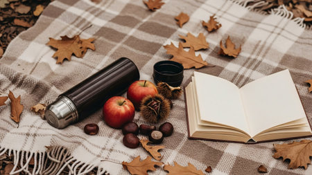An autumn picnic lifestyle presents on a trail on apples chestnuts reflecting harvest season golden sunlight bathing the full scene brown solo beige plaid thermos.
