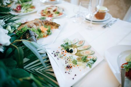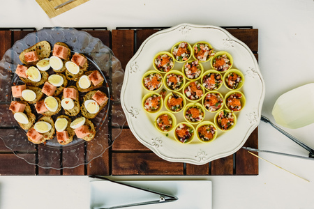 Canapes with cheese and vegetables. Catering and guest meals during the event. Quick mini snacks in a special beautiful dish. Canapes and light meals, tapas on the table in the restaurant.