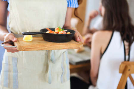 First-person view of waiter serving gourmet dish to eager guests at restaurant