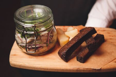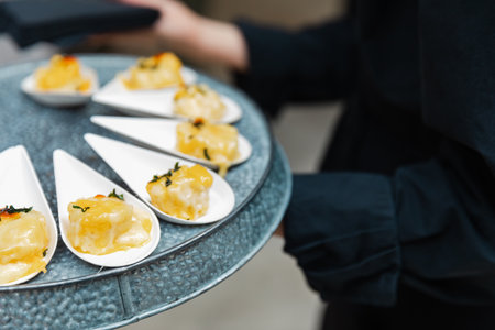 Waiter wearing black gloves carries snacks at a holiday event, party or wedding reception. Catering, waiter carries snacks on plates