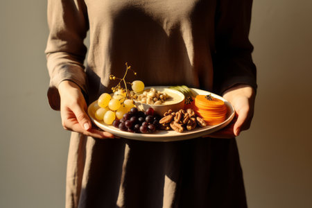 Enigmatic and Wholesome: A Crop of a Faceless Woman Exquisitely Presenting a Cheese Platter Enriched