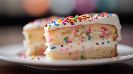 A delicious slice of vanilla cake adorned with vibrant sprinkles, served on a beautiful plate, perfect for any celebration or casual gathering, evoking joy and delight.