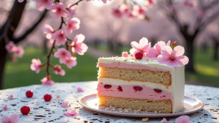 Cherry blossom cake slice with cream frosting on white plate in garden setting. That the image is generated using AI.