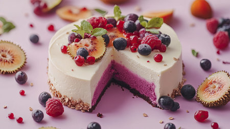 This stunning dessert features a creamy layered cake garnished with an array of fresh berries and mint leaves, set against a soft pink backdrop.