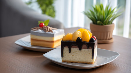 Delicious layered cake topped with fresh fruits at a cozy dessert setting
