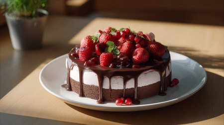 Indulgent chocolate cake with fresh berries and cream generated by artificial intelligence