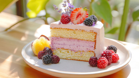 A beautifully presented slice of layered cake showcases soft sponge with vibrant berry filling, topped with fresh fruits and lavender, perfect for dessert.