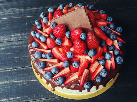 Chocolate cake in cocoa from above berries raspberries, black currant, biscuits, sweets on a round plate on the table. Cake slice, berries in macro. Birthday cake number 2. Top view, side view. Close-up