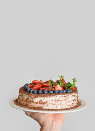 Homemade tasty biscuit cake with mascarpone cheese decorated berries, mint, strawberries and blueberries in hand. Vertical format. Birthday.