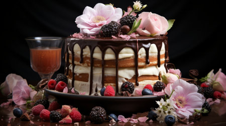 A cake with chocolate and flowers. Generative AI.