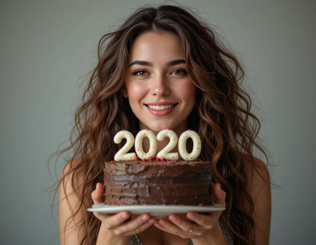 Beautiful young woman with cake on gray background. Happy New Year