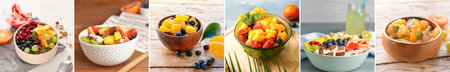 collage of photos of food and drinks of vegetables, fruits, dishes, cocktails, fish, ice cream in the form of a panorama