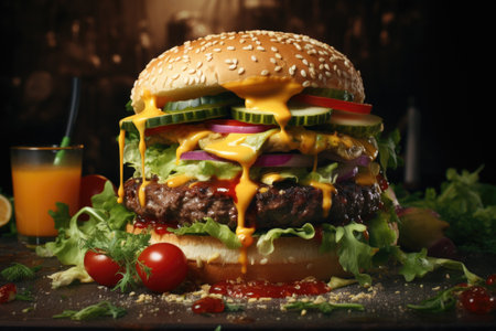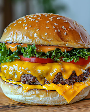 AI Generated. mouthwatering cheeseburger with sesame seed bun fresh lettuce and ripe tomatoes