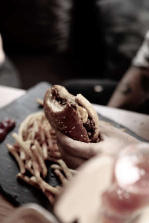 Delicious grilled beef burger served on wooden tray on the table with napkin in restaurant with black wall background