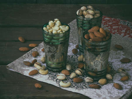 A composition from different varieties of nuts on a wooden background - almonds, cashews, pistachios